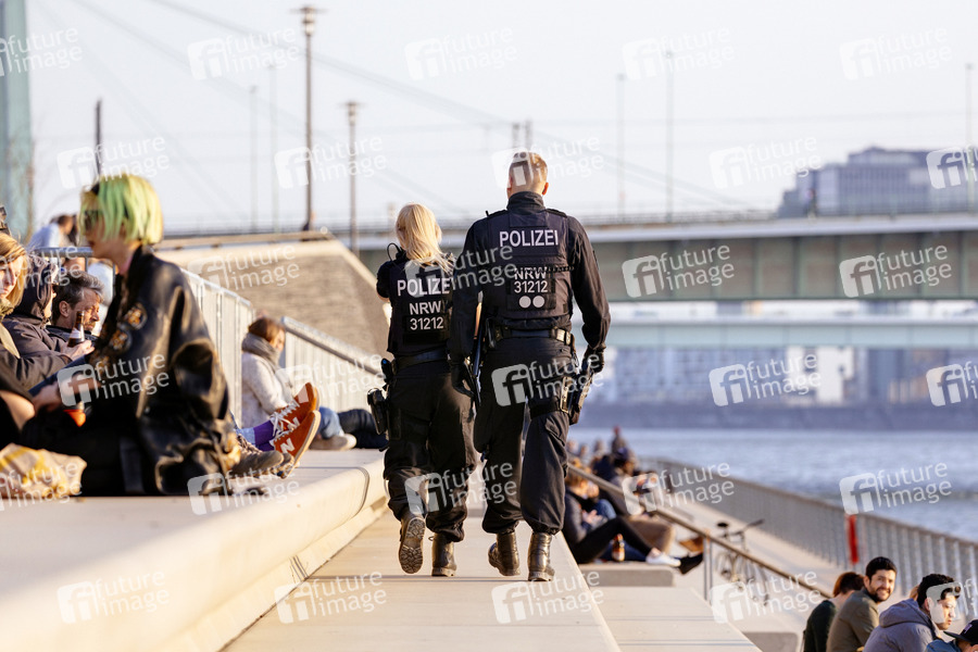 Die Polizei kontrolliert Kölner, die trotz den Ausgangsbeschränkungen während der Corona-Krise die Sonne am Rheinboulevard genießen. Köln, 28.03.2020
