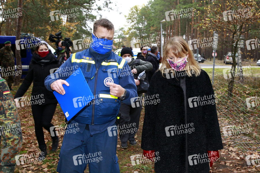 Andreas Heinrich und Petra Köpping beim Pressetermin zum Bau eines festen Zauns an der Restriktionszone zur Eindämmung der Afrikanischen Schweinepest im Truppenlager Werdeck. Krauschwitz, 11.11.2020