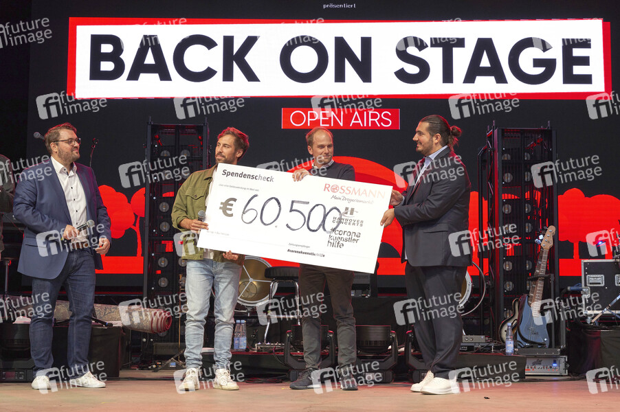 Max Giesinger, Raoul Roßmann und Nico Röger bei der Scheckübergabe vor dem Max Giesinger Charitykonzert im Rahmen der Konzertreihe 'Back on Stage' auf der Gilde Parkbühne. Hannover, 13.09.2021