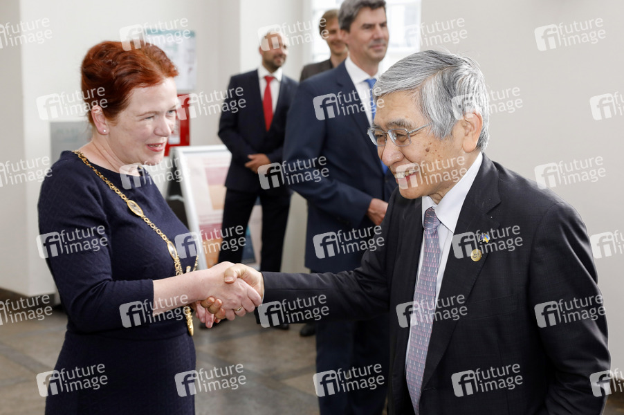 Katja Dörner und Haruhiko Kuroda beim Bildtermin vom Eintrag einiger G7-Finanzminister und Notenbankgouverneure ins Goldene Buch der Stadt Bonn im Alten Rathaus. Bonn, 19.05.2022