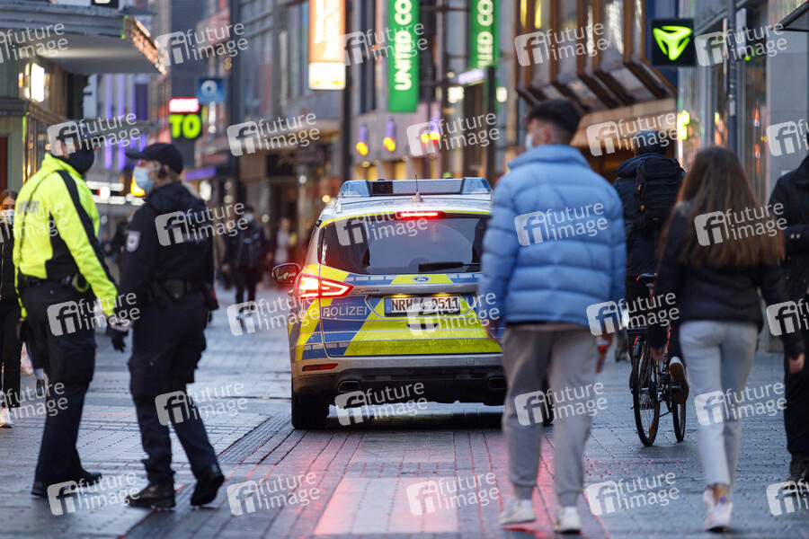 Wegen der Corona-Pandemie erfolgte Corona-Kontrollen aus dem vergangenen Jahr werden der Stadt Köln voraussichtlich mehrere hunderttausend Euro in die Kassen spülen. Buß- und Verwarngelder in Gesamthöhe von gut 609.000 Euro hat die Stadt bisher eingenommen. Im Bild eine Polizeistreife in der Fußgängerzone Hohe Straße, wo Corona-Regeln wie Maskenpflicht und Mindestabstand gelten. (Themenbild, Symbolbild) Köln, 01.02.2021