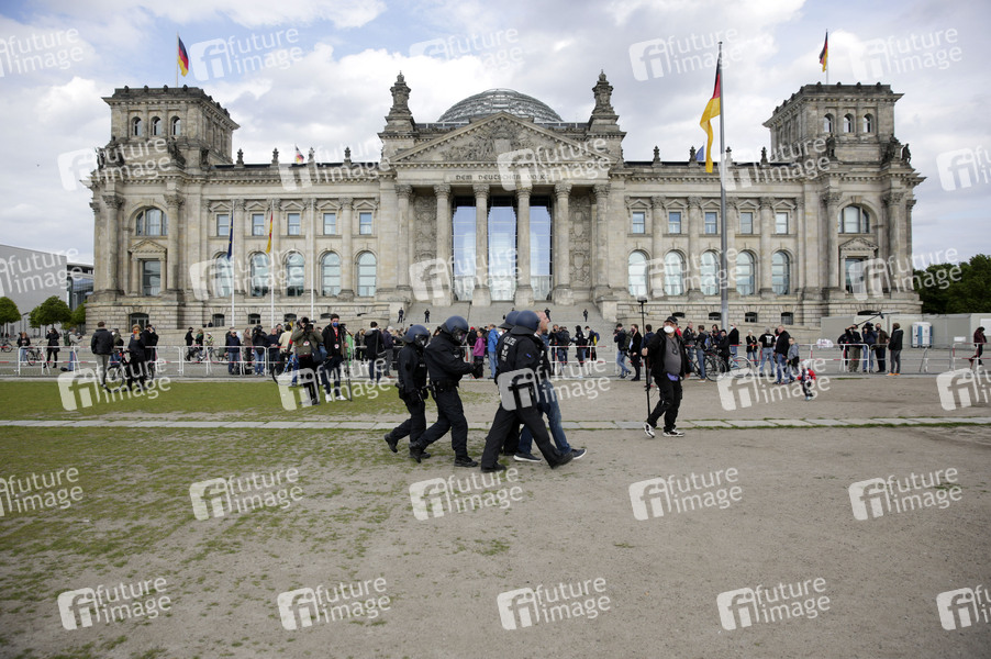 Am Rande der 'Hygienedemo' gegen die Coronamaßnahmen der Bundesregierung vor dem Reichstagsgebäude kommt es zu einigen Verhaftungen. Berlin, 16.05.2020