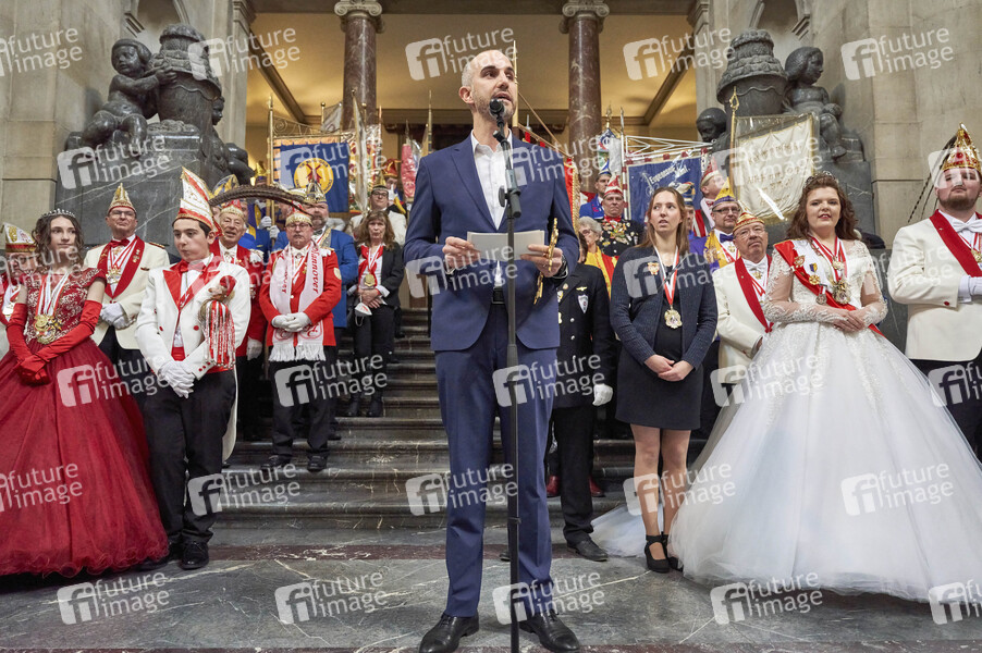 Belit Onay bei der Stürmung des Neuen Rathauses durch die Hannoveraner Karnevalsvereine und der Proklamation der Prinzenpaare 2021 mit Übergabe des Stadtschlüssels. Hannover, 13.11.2021