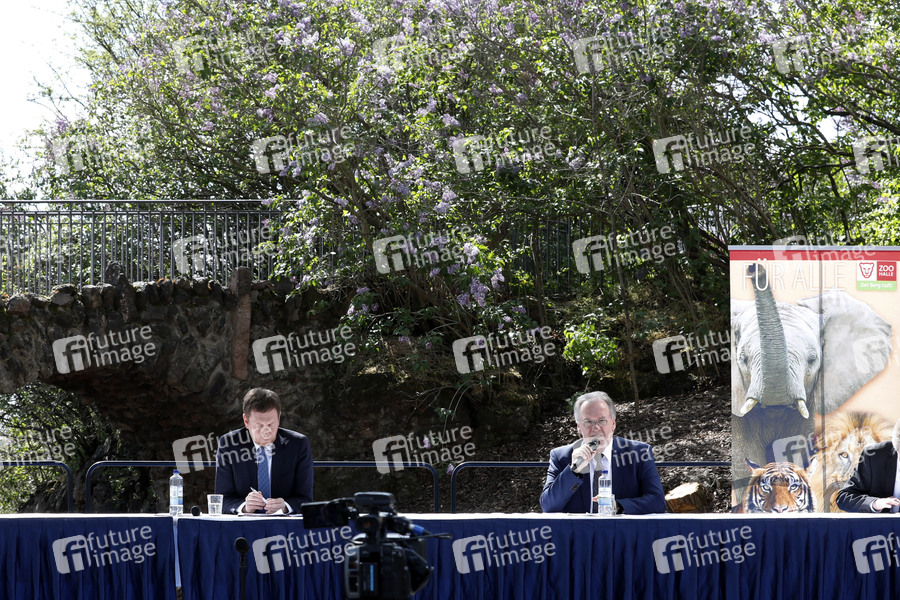 Michael Kretschmer und Reiner Haseloff beim Pressegespräch über das weitere Vorgehen in der Corona-Pandemie im Zoo Halle. Halle (Saale), 26.04.2020