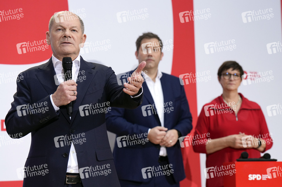 Olaf Scholz, Lars Klingbeil und Saskia Esken bei der Pressekonferenz der SPD nach den Gremiensitzungen zur Beratung aktueller Themen und der Nominierung des SPD-Kanzlerkandidaten für die Bundestagswahl im Atrium vom Willy-Brandt-Haus. Berlin, 25.11.2024