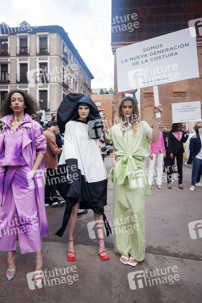 Fashion Show von 10 Modedesignern, die konzipiert wurden, um die charakteristische Mode zu feiern und ihre Rolle in der spanischen Wirtschaft und Kultur zurückzugewinnen auf dem Paseo del Prado. Madrid, 11.04.2021