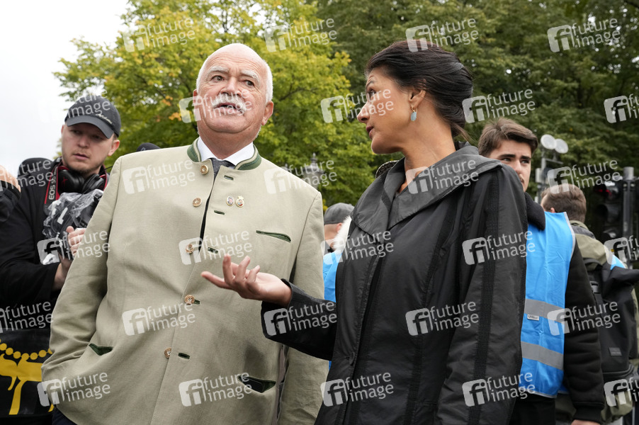Peter Gauweiler und Sahra Wagenknecht bei der Friedensdemonstration unter dem Motto 'Nein zu Krieg und Hochrüstung! Ja zu Frieden und internationaler Solidarität' vor der Siedessäule am Großen Stern. Berlin, 03.10.2024