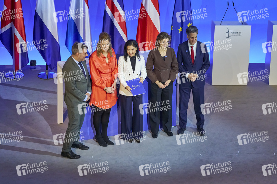 Lars Aagaard (Minister für Klima, Energie und Versorgung, Dänemark), Annelies Verlinden (Ministerin für Justiz und den belgischen Teil der Nordsee, Belgien), Katherina Reiche (Bundesministerin für Wirtschaft und Energie), Sophie Hermans (Ministerin für für Klimapolitik und grünes Wachstum, Niederlande) und Ed Miliband (Minister für Energiesicherheit und NetZero, Vereinigtes Königreich) bei der Unterzeichnungszeremonie beim 3. internationalen Nordsee-Gipfel 2026 auf Ebene der Regierungschefinnen und -chefs sowie der Energieministerinnen und Energieminister im Rathaus. Ziel des Gipfels ist es, den grenzüberschreitenden Ausbau der Offshore-Windenergie, den Wasserstoffmarkt und zugleich eine leistungsfähige und vernetzte Offshore-Infrastruktur im gesamten Nordseeraum weiter voranzutreiben. Hamburg, 26.01.2026