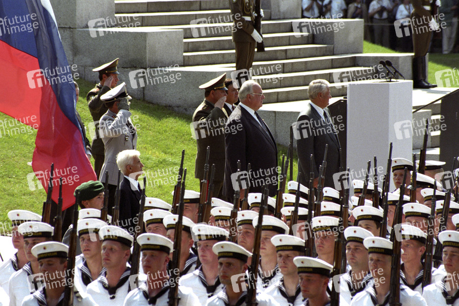 Helmut Kohl und Boris N. Jelzin bei der Militärparade zur Verabschiedung der russischen Streitkräfte aus Deutschland am sowjetischen Ehrenmal in Berlin-Treptow. Berlin, 31.08.1994