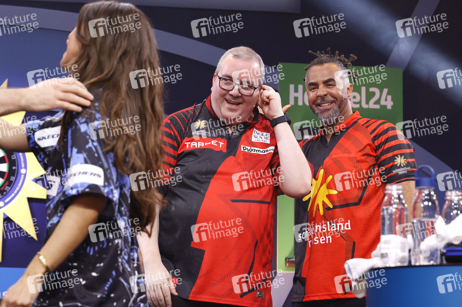 Stephen Bunting und Patrick Owomoyela bei der Promi-Darts-WM 2025 im Maritim Hotel. Düsseldorf, 05.01.2025