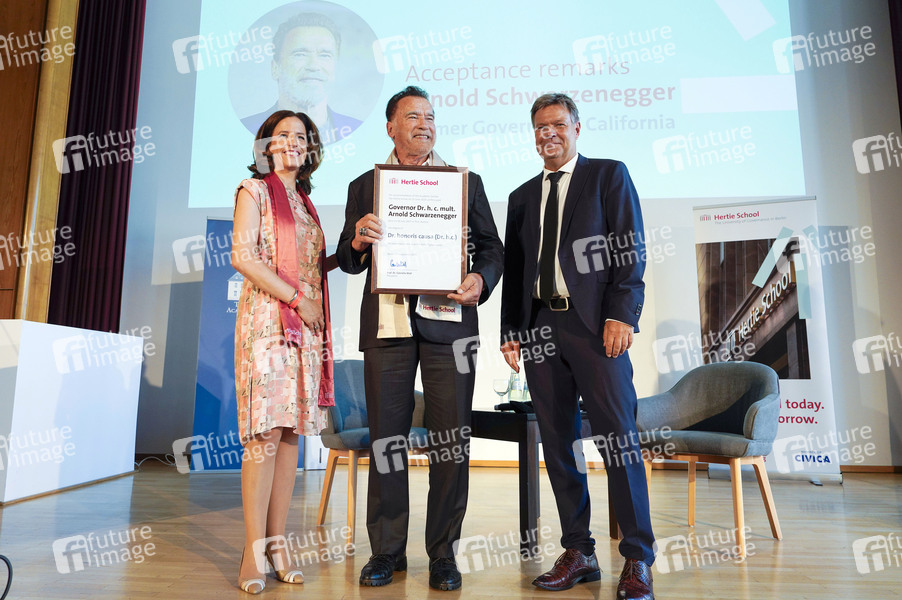 Cornelia Woll, Robert Habeck und Arnold Schwarzenegger bei der Verleihung der Ehrendoktorwürde an Arnold Schwarzenegger in Anerkennung seiner bedeutenden Beiträge im Bereich Governance, insbesondere durch seine Arbeit im Bereich Nachhaltigkeit und bürgerschaftliches Engagement in der Hertie School. Berlin, 17.09.2024