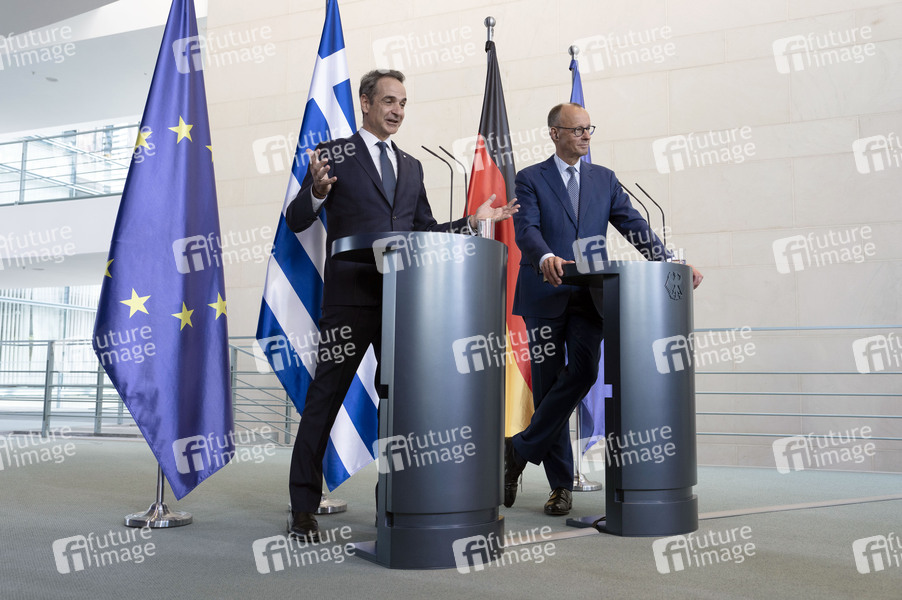 Kyriakos Mitsotakis und Friedrich Merz beim Empfang des Ministerpräsidenten von Griechenland mit militärischen Ehren mit anschließendem Pressestatement im Bundeskanzleramt. Berlin, 13.05.2025