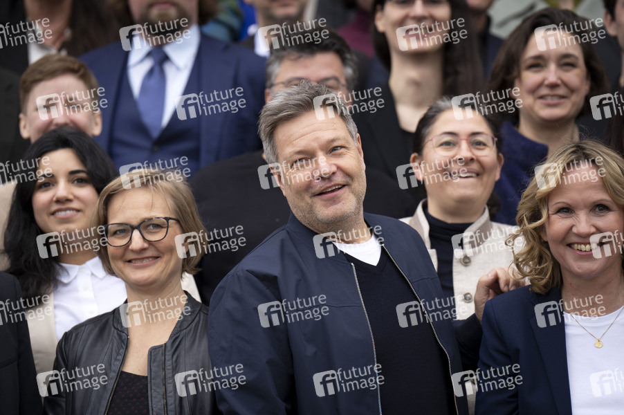 Robert Habeck beim Gruppenfoto der neuen Bündnis 90/Die Grünen Fraktion nach der Fraktionssitzung der Bündnis 90/Die Grünen-Bundestagsfraktion auf der Treppe zum Reichstagsgebäude. Berlin, 26.02.2025