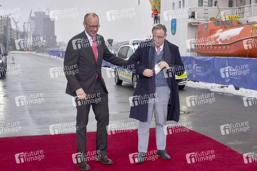 Friedrich Merz und Bart De Wever beim Treffen der Regierungschefs zum 3. internationalen Nordsee-Gipfel 2026 im Cruise Ship Center Baakenhöft und einem Besuch auf dem Mehrzweckschiff 'Neuwerk'. Ziel des Gipfels ist es, den grenzüberschreitenden Ausbau der Offshore-Windenergie, den Wasserstoffmarkt und zugleich eine leistungsfähige und vernetzte Offshore-Infrastruktur im gesamten Nordseeraum weiter voranzutreiben. Hamburg, 26.01.2026
