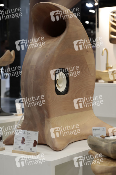 Massivholz-Lautsprecherbox beim Presserundgang zur Eröffnung der imm cologne - World of Interiors, der Fachmesse für Möbel und Innenraumgestaltung, in der Koelnmesse, Köln, 20.01.2026