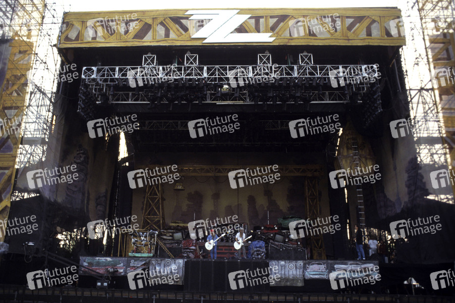 Dusty Hill, Frank Beard und Billy Gibbons von ZZ Top beim Soundcheck zum Konzert der 'Recycler World Tour' in der Milton Keynes Bowl. Milton Keynes, 06.07.1991