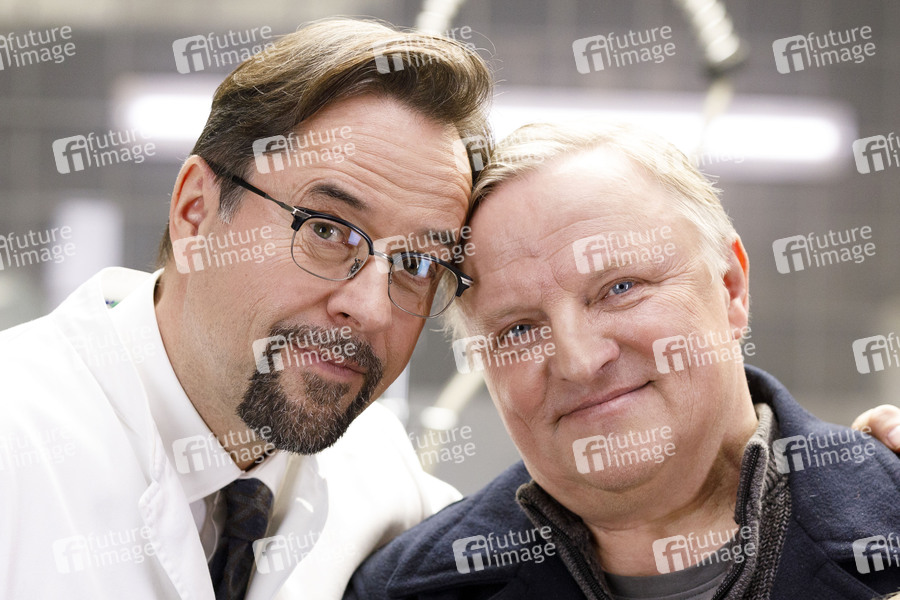 Schauspieler, Prof. Karl-Friedrich Boerne und Kriminalhauptkommissar Frank Thiel in 'Tatort', Prominenz, TV, Fernsehen, Krimi, Filmset, Fotocall, Photocall, Settermin, Dreharbeiten, TV-Film, Krimireihe, Serie, ARD, Das Erste, WDR, Tatort Münster, Rechtsmedizin