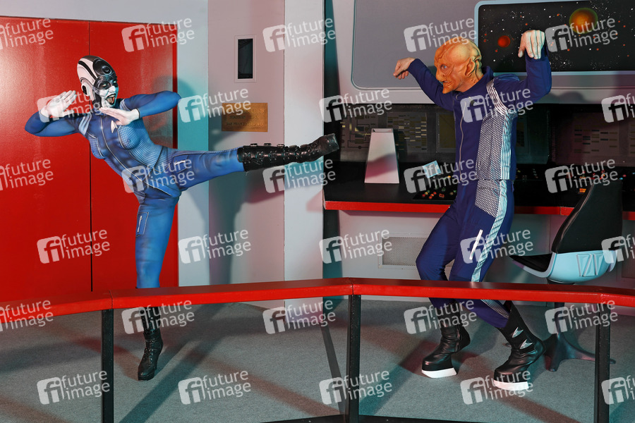 GEEK ART - Bodypainting meets SciFi, Fantasy and more: 'Star Trek Discovery' Photoshooting mit Model Barbara Wegener als Airiam und Enrico Lein als Saru auf der Brücke vom Raumschiff Enterprise im Filmwelt Center. Bad Münder, 18.04.2019 - Ein Projekt des Fotografen Tschiponnique Skupin und des Bodypainters und Transformakers Enrico Lein