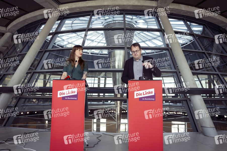 Heidi Reichinnek und Sören Pellmann bei einem Pressestatement der Partei Die Linke im Reichstagsgebäude. Berlin, 20.05.2025