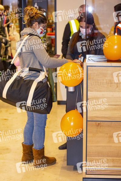 Allererster kommerzieller Abflug vom BER mit easyJet nach London Gatwick am Gate im Non-Schengen-Bereich des Terminal 1 im Flughafen Berlin Brandenburg. Schönefeld, 01.11.2020