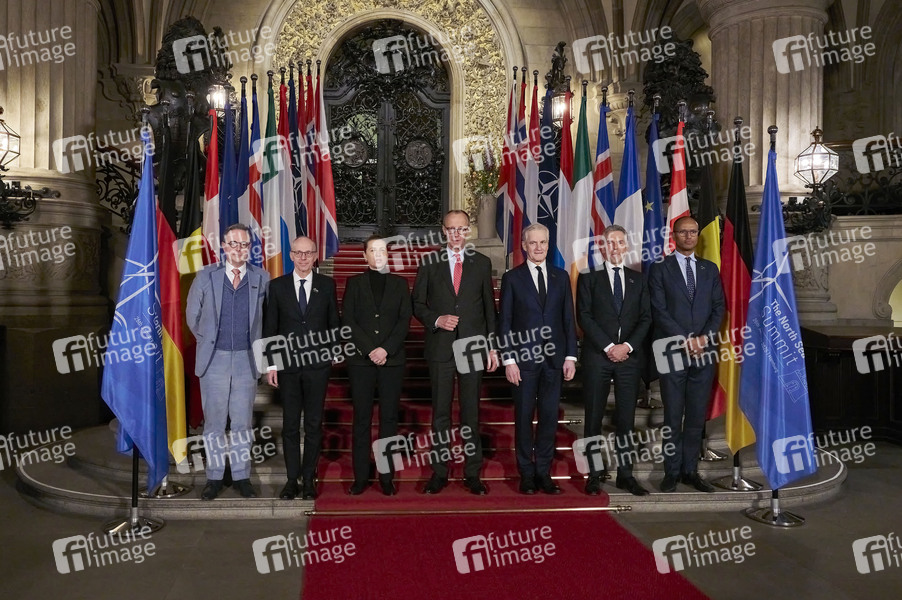 Bart De Wever (Premierminister von Belgien), Luc Frieden (Premierminister von Luxemburg), Mette Frederiksen (Ministerpräsidentin von Dänemark), Friedrich Merz (Bundeskanzler von Deutschland), Jonas Gahr Store (Ministerpräsident von Norwegen), Dick Schoof (Ministerpräsident der Niederlande), und Jean-Charles Ellermann-Kingombe (Stellvertretender Generalsekretär für Cyber- und Digitale Transformation der NATO) beim Treffen der Regierungschefs zum 3. internationalen Nordsee-Gipfel 2026 im Rathaus. Ziel des Gipfels ist es, den grenzüberschreitenden Ausbau der Offshore-Windenergie, den Wasserstoffmarkt und zugleich eine leistungsfähige und vernetzte Offshore-Infrastruktur im gesamten Nordseeraum weiter voranzutreiben. Hamburg, 26.01.2026