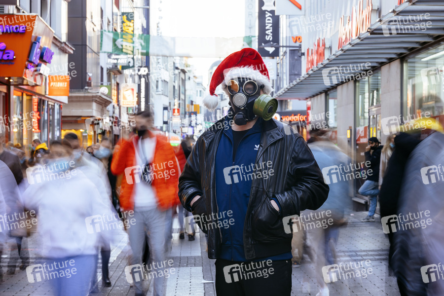 Ein Mann mit Gasmake und Nikolausmütze posiert in der Hohe Straße. In der Einkaufszone gilt wie auch in anderen Fußgängerzonen in Köln während der Coronakrise Maskenpflicht. (Themenbild, Symbolbild) Köln, 16.11.2020