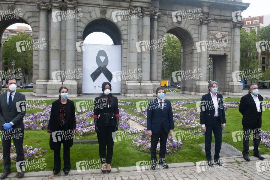 Madrids Bürgermeister Jose Luis Martinez-Almeida mit Vertretern der Gemeinde bei einer Schweigeminute für die Covid-19 Opfer an der Puerta de Alcalá am 40. Tag seit Verhängung des Ausnahmezustands durch die spanische Regierung wegen der Coronakrise. Madrid, 23.04.2020