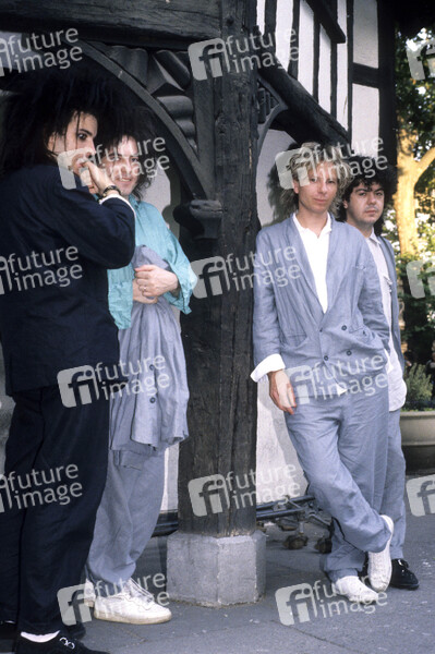Simon Gallup, Robert Smith, Boris Williams und Laurence Tolhurst von The Cure bei einem Fototermin am Soho Square. London, 15.03.1986