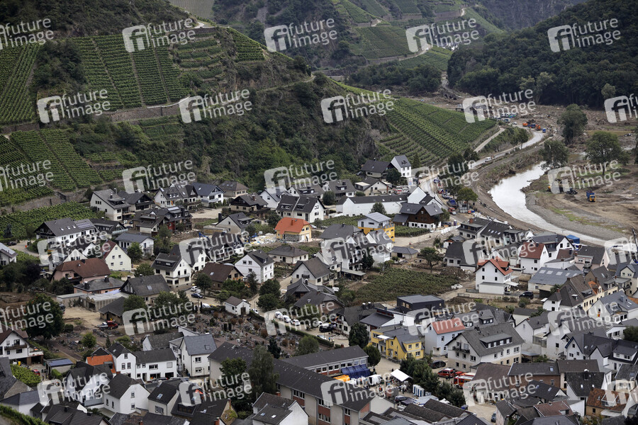 Nach dem Jahrhunderthochwasser in der Eifel durch heftige Regenfälle und Dauerregen mit Überschwemmungen und Überflutungen haben die Aufräumarbeiten im Ahrtal große Fortschritte gemacht. Einheiten von Polizei, THW, Bundeswehr und Feuerwehr mitsamt vielen freiwilligen Helfern haben Straßen geräumt, Schutt und Schlamm entfernt und die Menschen versorgt. Der Wiederaufbau wird trotzdem Jahre dauern. Im Bild Flutschäden in der Ortschaft Dernau, in der die Flut viele Häuser zerstörte, 08.08.2021