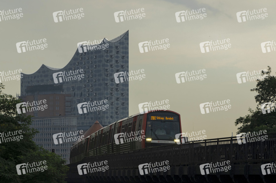 Starke Regenfälle und Gewitter sorgen diesen Sommer vermehrt für Unwetterwarnung: Elbphilharmonie und U-Bahn der Linie U3 im Regen an den Landungsbrücken im Hafen. Hamburg, 14.08.2024