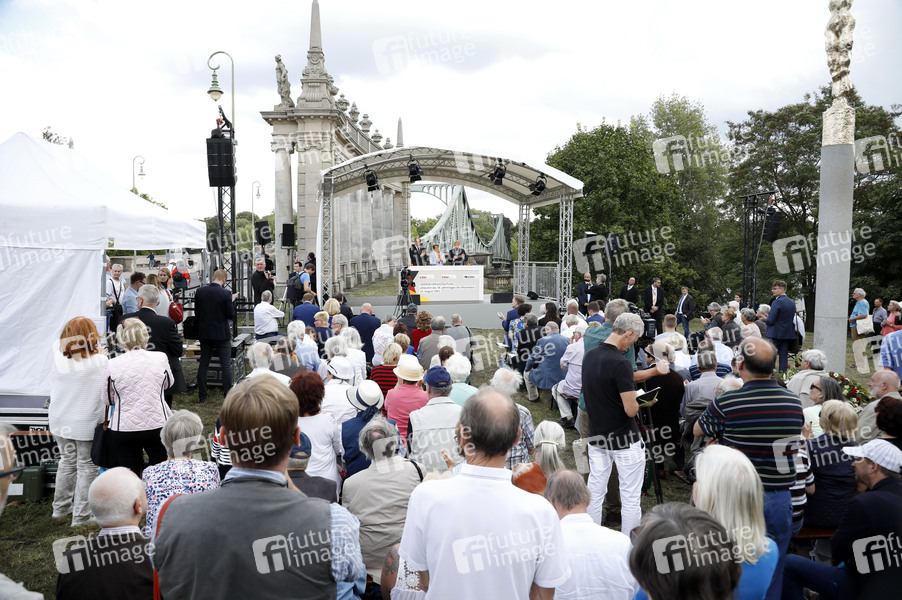 Ingo Senftleben, Annegret Kramp-Karrenbauer und Kai Wegner bei einer Gedenkveranstaltung der Brandenburger und Berliner CDU anlässlich des 58. Jahrestages des Mauerbaus an der Glienicker Brücke. Potsdam, 13.08.2019