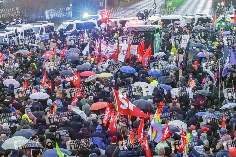 Demonstration im Düsseldorfer Stadtteil Garath gegen den Auftritt von Björn Höcke bei einer Veranstaltung des AfD-Kreisverbandes Düsseldorf. Düsseldorf, 23.02.2026
