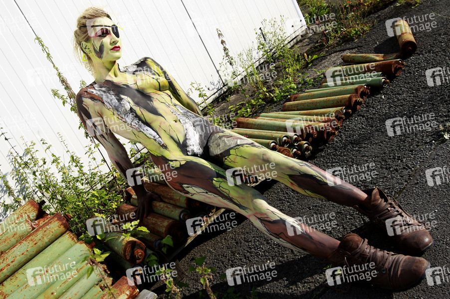 Bodypainting und Photoshooting mit Model Jutta auf einem Industriegelände in Hameln. Bodypaint-Künstler: Jörg Düsterwald, Make-Up und Hairstyling: Nadja Lück