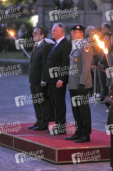 Boris Pistorius,Stephan Weil und Oberst Dirk Waldau bei der Serenade zu Ehren von Ministerpräsident Stephan Weil zu dessen Rückzug aus der Politik vor dem Gartensaal vom Neuen Rathaus. Hannover, 19.05.2025