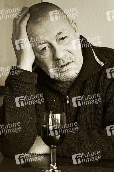 alter Mann, unrasiert, Stoppelbart, Glas Wein