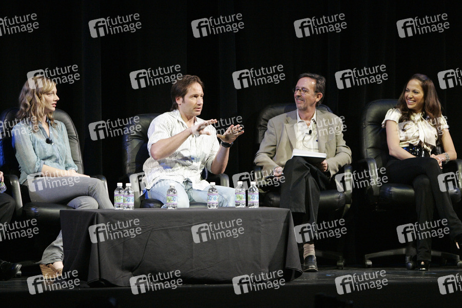 Judy Greer, David Duchovny, Gregg Kilday und Jennifer Lopez bei einer Independent Film Podiumsdiskussion auf der ShoWest 2007 im Paris Hotel. Las Vegas, 14.03.2007
