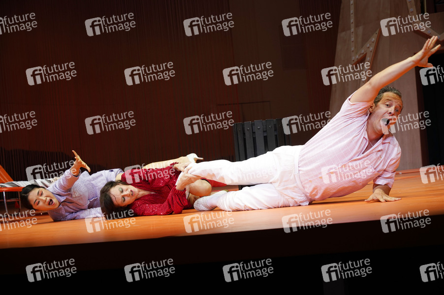 Kotbong Yang, Sophie Rois und Trystan Pütter bei der Fotoprobe zum Theaterstück 'Liebe, einfach außerirdisch' im Deutschen Theater. Berlin, 28.06.2022
