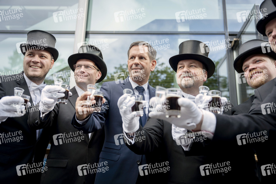 Olaf Lies beim Trinken von Lüttje Lage beim Sommerfest der Landesvertretung Niedersachsen in der Vertretung des Landes Niedersachsen beim Bund. Berlin, 23.06.2025