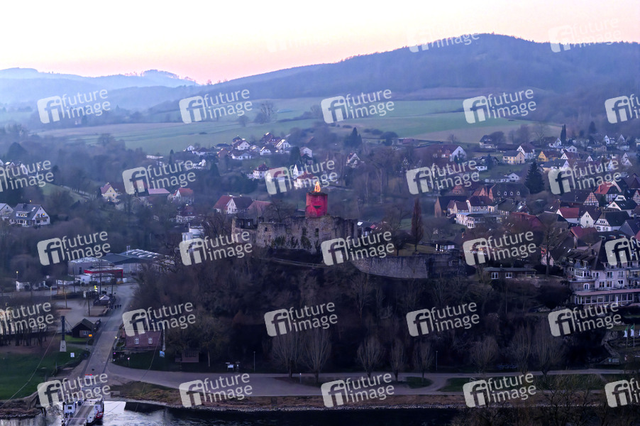 Advent, Adventszeit, Weihnachtszeit, Weihnachten, Christmas, X-Mas, Kerze, Riesenkerze, Weserbergland, Eversteiner Burg, Sehenswürdigkeit an der Weser, Ruine, Höhenburg, Luftaufnahme, Drohnenaufnahme