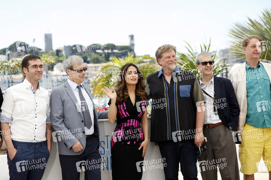 Tomm Moore, Gaetan Brizzi, Salma Hayek, Roger Allers, Paul Brizzi und Bill Plympton beim Photocall zur 'Hommage au cinema d'animation' auf dem Festival de Cannes 2014 / 67. Internationale Filmfestspiele von Cannes, 17.06.2014