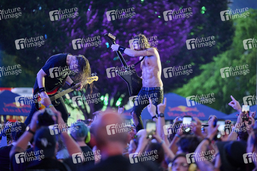 Justin Street und Joel O'Keeffe von Airbourne live auf dem Summerside Festival 2025 beim Flugplatz. Grenchen, 28.06.2025
