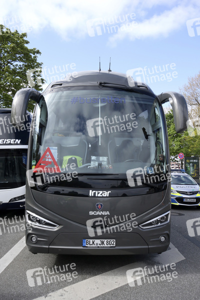 Unter dem Motto 'Rettung der flexiblen und individuellen Reise-Busbranche' demonstrieren Busunternehmer aus Norddeutschland mit einem Konvoi von Reisebussen gegen die aktuellen Reisebeschränkungen aufgrund der Corona-Pandemie. Hamburg, 07.05.2020