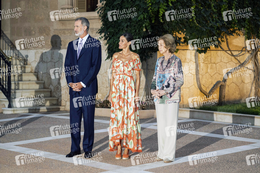 König Felipe VI. von Spanien, Königin Letizia von Spanien und die ehemalige Königin von Spanien Sofia empfangen Repräsentanten der balearischen Behörden und Gesellschaft im Palacio de Marivent. Palma de Mallorca, 04.08.2022