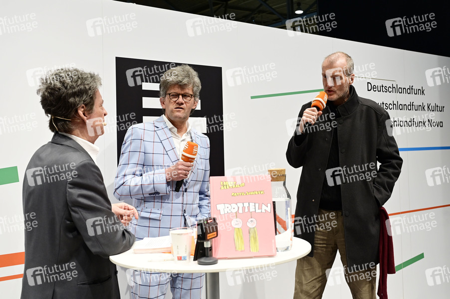 Joachim Scholl, Marcus Weimer von Rattelschneck und Robert Seethaler beim Gespräch zum Buch 'Trotteln' am Messestand von Deutschlandfunk / Deutschlandradio in Halle 2 auf der Leipziger Buchmesse 2025 auf dem Messegelände. Leipzig, 28.03.2025