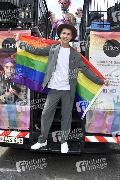 Maximillian Seitz auf dem JFMS Truck von Julian F. M. Stoeckel bei der 44. Christopher Street Day Parade 2022 unter dem Motto 'United in Love! Gegen Hass, Krieg und Diskriminierung' vom Spittelmarkt auf gut sieben Kilometern über Potsdamer Platz und Potsdamer Straße zum Nollendorfplatz, von dort weiter zur Siegessäule und zum Brandenburger Tor. Berlin, 23.07.2022