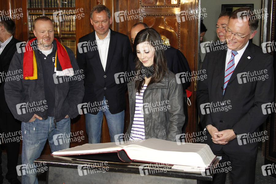 Nach ihrem Sieg beim Eurovision Song Contest in Oslo, trägt sich die Siegerin Lena ins Goldene Buch der Stadt Hannover ein