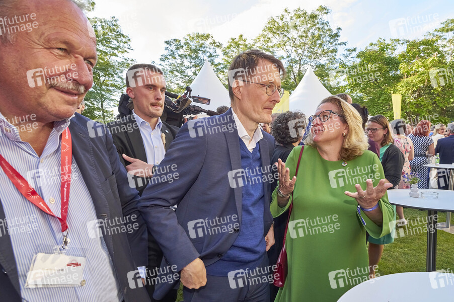 Frank Bsirske, Karl Lauterbach und Svenja Schulze beim Sommerfest der Niedersächsischen Landesregierung 2024 in der Vertretung des Landes Niedersachsen beim Bund. Berlin, 24.06.2024