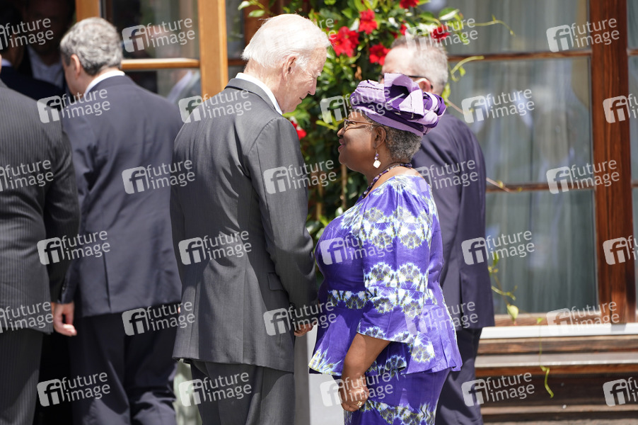 Joe Biden und Ngozi Okonjo-Iweala beim Fototermin zum erweiterten Familienfoto im Rahmen der Outreach-Arbeitssitzung am zweiten Tag des G7-Gipfels auf Schloss Elmau. Die Staats- und Regierungschefs der G7-Gruppe kommen offiziell unter dem Motto 'Fortschritt hin zu einer gerechten Welt' zusammen und werden globale Themen wie Krieg, Klimawandel, Hunger, Armut und Gesundheit diskutieren. Der Gipfel wird vom anhaltenden russischen Krieg gegen die Ukraine überschattet. Klais, 27.06.2022