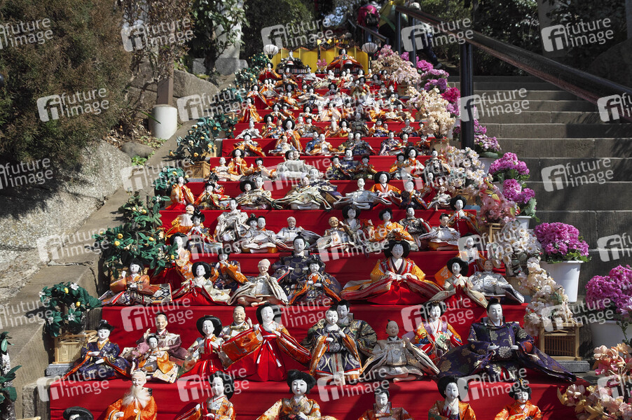 Etwa 1000 traditionelle Hina-Puppen auf den 77 Stufen des Zama-Schreins. Das Hina Matsuri, das Puppen- oder Mädchenfest, findet in Japan jedes Jahr am 3. März statt. Hierbei handelt es sich um ein japanisches Familienfest, anlässlich dessen für Glück und Gesundheit junger Mädchen gebetet wird. Zama, 01.03.2022