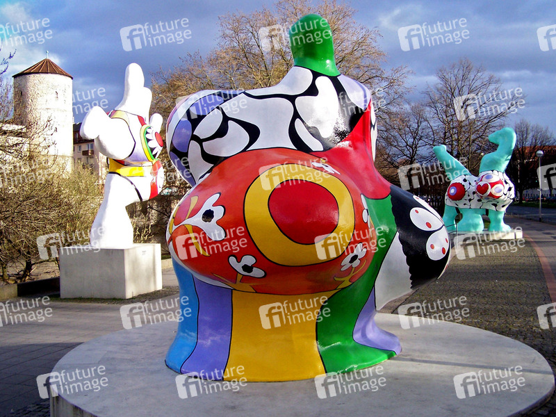 Kunstwerk von Niki de Saint Phalle von 1974, Frauenfiguren mit überdimensionierten Geschlechtsteilen